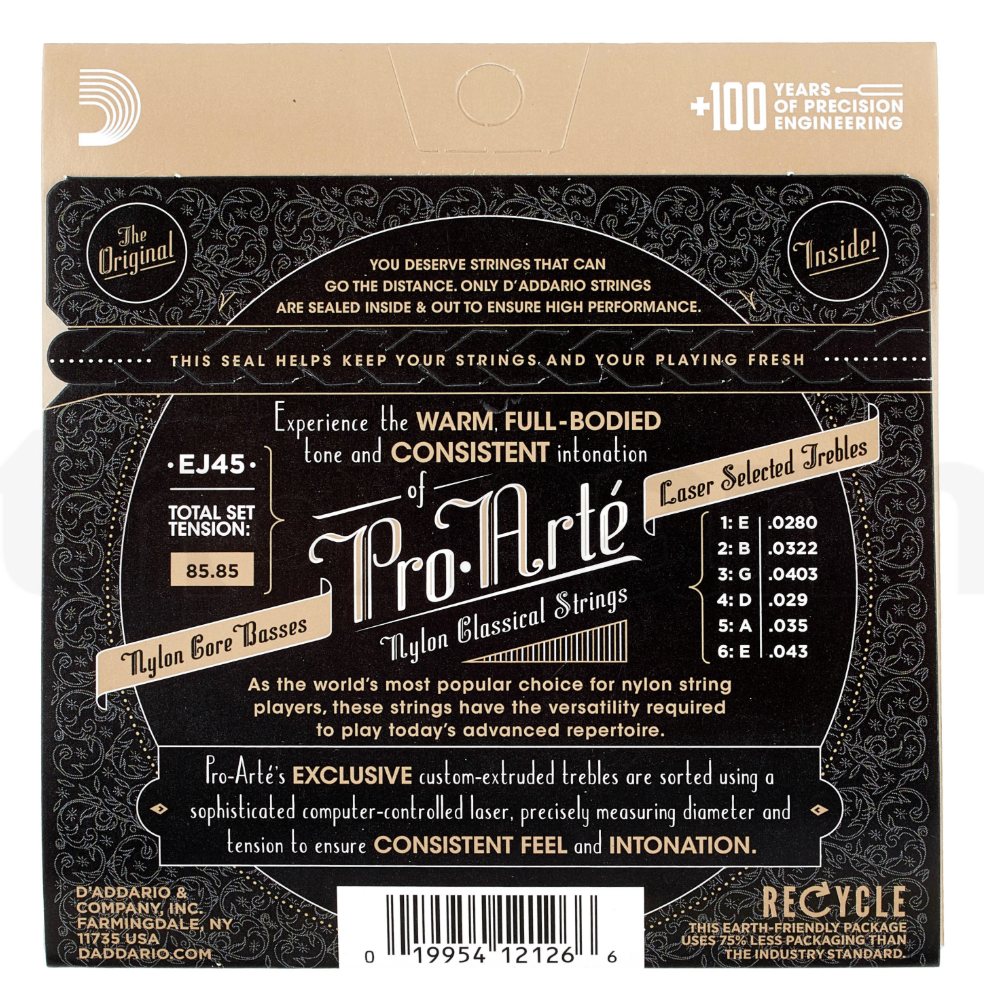 Parte da linha Pro-Arté Nylon da D’Addario — uma das séries mais tradicionais e populares da marca para guitarras clássicas.