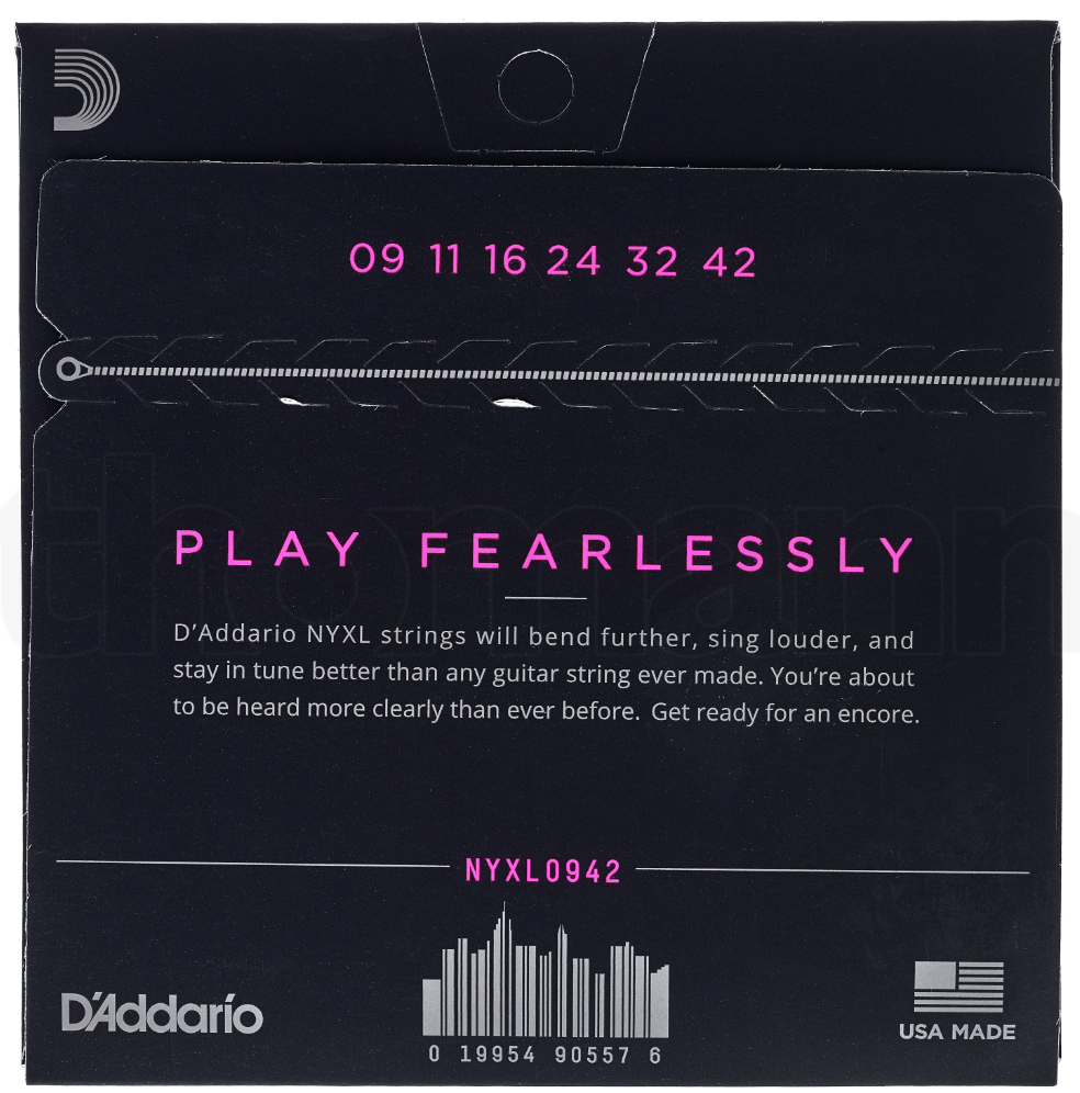 🔩 Construção: Núcleo de aço de alto carbono (NY Steel) e enrolamento em aço niquelado, com tecnologia Fusion Twist para maior resistência e melhor estabilidade de afinação comparado a conjuntos normais.