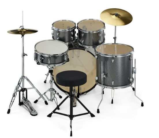 É um conjunto de bateria acústica de 5 peças que inclui tambores, ferragens (hardware), pratos e banco — basicamente tudo o que precisas para começar a tocar sem comprar peças separadas.