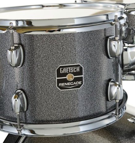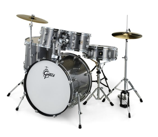 Gretsch Renegade 5‑Piece Complete Drum Kit with Hardware, Cymbals & Throne — um kit de bateria acústica completa da Gretsch na cor Grey Sparkle (acabamento cinzento brilhante) ideal para quem quer começar ou tocar regularmente com um set pronto a usar imediatamente.