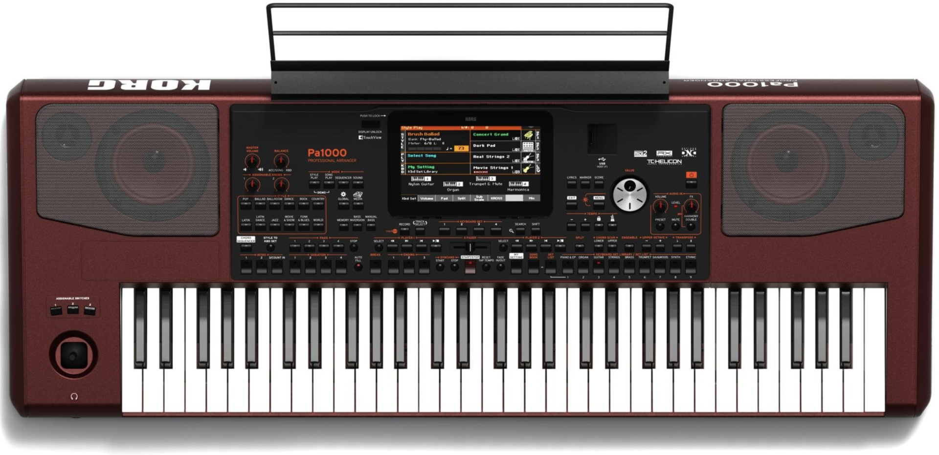 O mecanismo de som do Pa1000 usa quatro vezes mais memória PCM que o campeão de vendas Pa900 e expande a quantidade de memória PCM de usuário para 600 MB usando compressão. O número de localidades de Style de usuário também foi expandido para um máximo de 1152, o que cobre praticamente cada estilo musical imaginável. O sistema de falantes aprimorado produz um som forte e encorpado, aprimorado por funções como TC Helicon Vocal Harmonizer, Dual Mp3 Player & Recorder e Dual Crossfade Sequencer. A saída de vídeo é padronizada, para que seu público possa cantar juntamente com as letras exibidas na tela. O Pa1000 reúne tudo isso em um gabinete de alta qualidade com inserções de alumínio nos painéis laterais e um chassis elegante para proporcionar um visual prestigioso em qualquer palco!