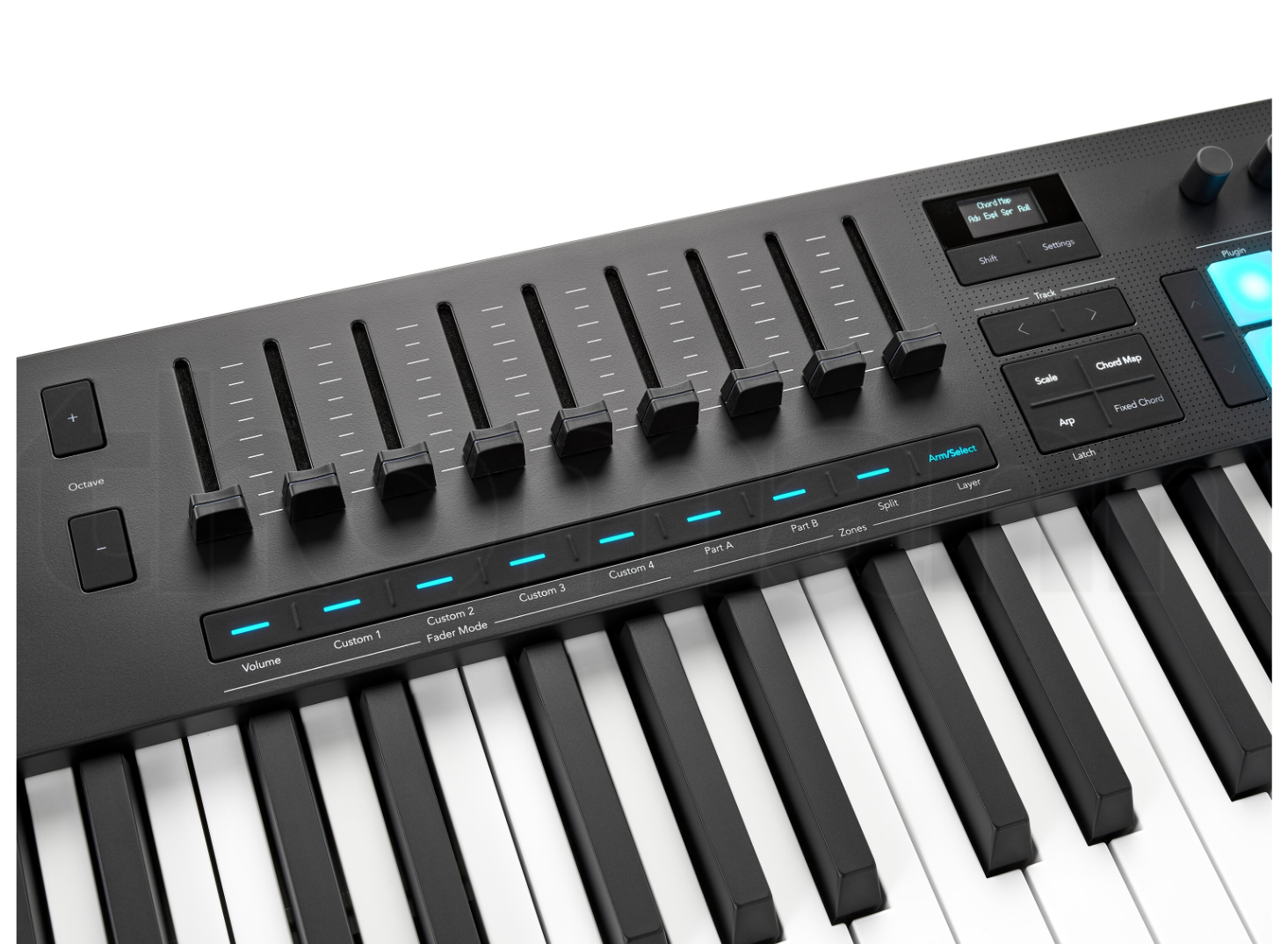 O Launchkey 61 tem 61 teclas de tamanho completo, sensíveis à velocidade (ou seja, o volume e a expressividade variam conforme a força com que as teclas são pressionadas).
