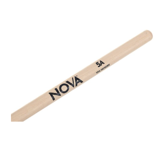 Baquetas de bateria Vic Firth Nova 5A com ponta de madeira (wood tip) — ideais para quem procura um par versátil e acessível. Produzidas em hickory (madeira resistente, absorve bem os impactos e é confortável para tocar). Tamanho 5A: o tamanho mais popular, ótimo para muitos estilos musicais (rock, pop, jazz, funk, prática em geral). Comprimento: cerca de 406 mm (~16″). Diâmetro: cerca de 14,3 mm (~0.565″). Forma da ponta: oval / lágrima, o que dá um som equilibrado e rico nos pratos. Taper (afilamento): médio — oferece bom equilíbrio entre potência e controle.